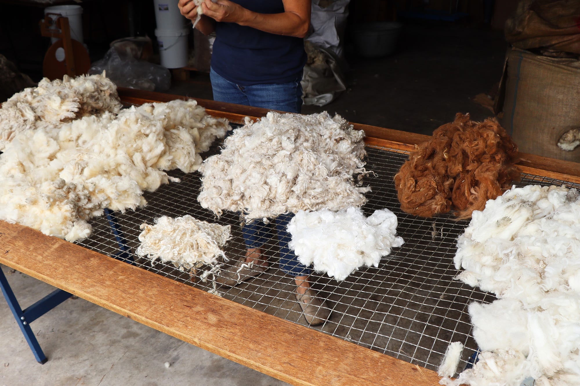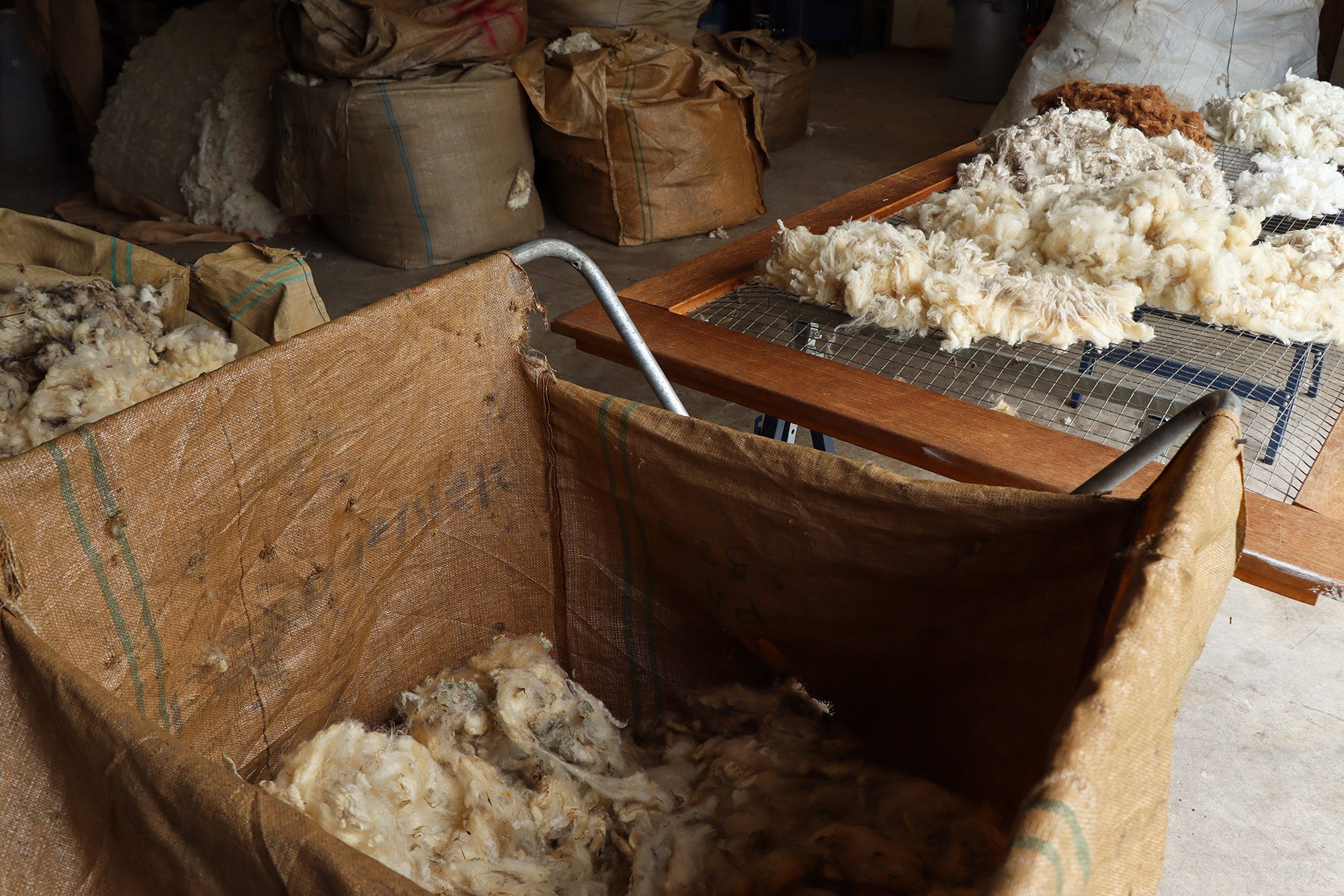 We lopen de grote schuur in, waar allerlei soorten wol liggen uitgestald. Allemaal zo verschillend, van superzacht en wit tot donkerder en stug. Ze liggen er met een reden: The Knitwit Stable is ook een duurzaam educatiecentrum. Studenten, teams van bedrijven en nieuwsgierige consumenten komen hier om het proces achter een wollen kledingstuk van dichtbij te zien.