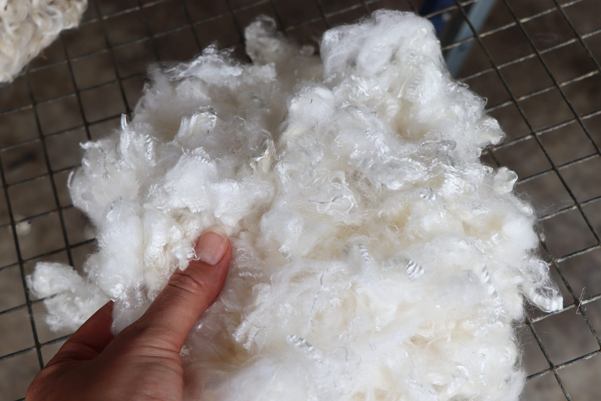 Dan het wassen: de wol zit vol lanoline (dat wolvet dat in cosmetica wordt gebruikt), gras, stro en soms mest. Grote wasfaciliteiten hebben we hier niet meer, dus gaat de wol vaak in batches naar België of Italië.