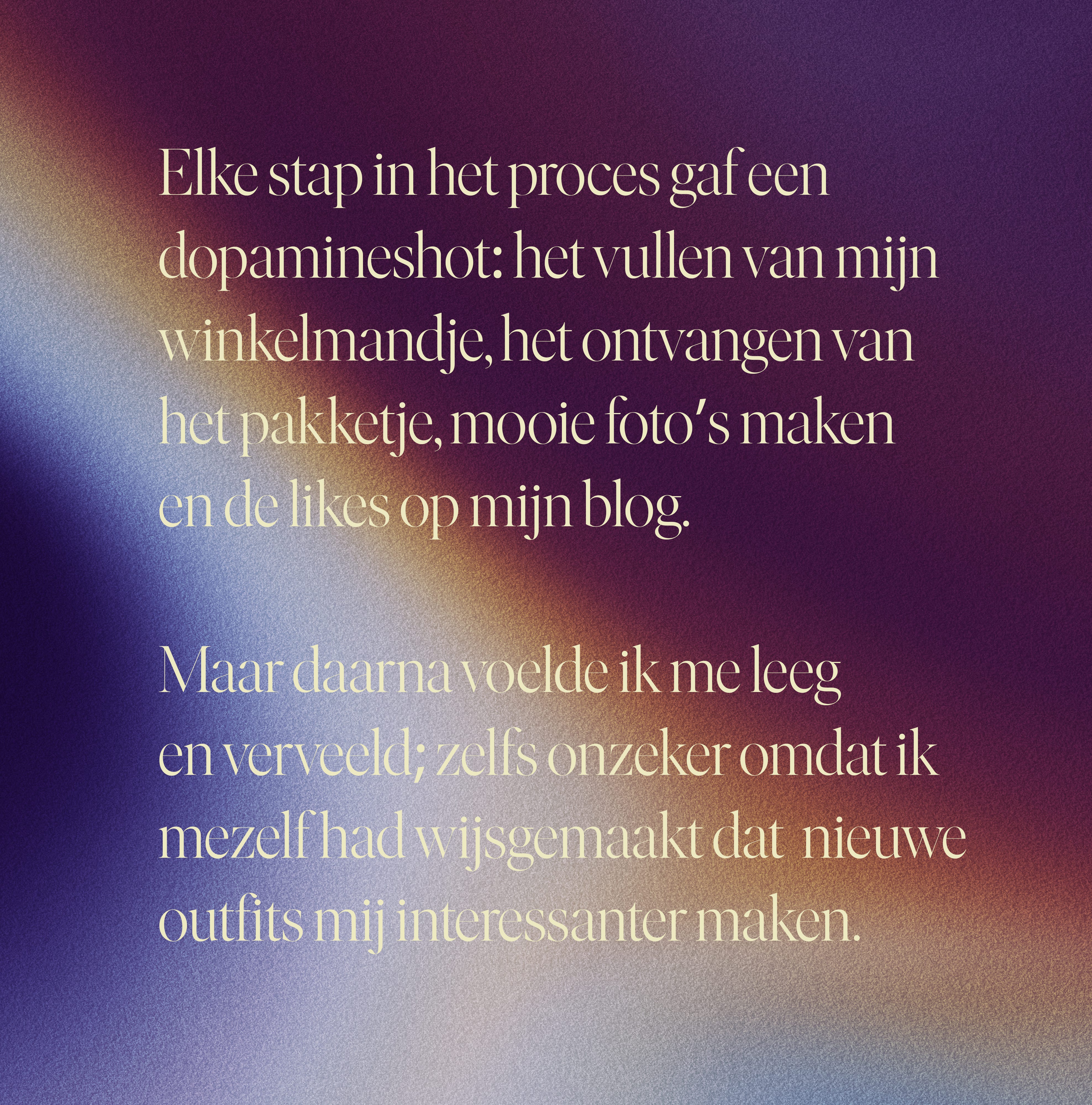 Ik herken dit gevoel van 12 jaar geleden. Dan voelde ik me gelukkig na een aankoop, vooral als ik een nieuwe outfit voor mijn fast fashion blog droeg en foto’s maakte. Maar al snel was het nieuwe eraf. Het kledingstuk begon te vervelen en ik zocht weer op Asos of Topshop naar een nieuwe deal waarmee ik kon shinen. Elke stap in het proces gaf een dopamineshot: het vullen van mijn winkelmandje, het ontvangen van het pakketje, de foto’s maken en de likes op mijn blog. Maar daarna voelde ik me leeg en verveeld; zelfs onzeker omdat ik mezelf had wijsgemaakt dat nieuwe outfits mij interessanter maken. Dus verkocht ik het door op Marktplaats en begon opnieuw. En opnieuw. En opnieuw. Ik was me hier niet heel bewust van, maar voelde wel constant een soort onrust. Dan kon ik na een aankoop al de volgende blogoutfit visualiseren en op zoek naar iets nieuws.