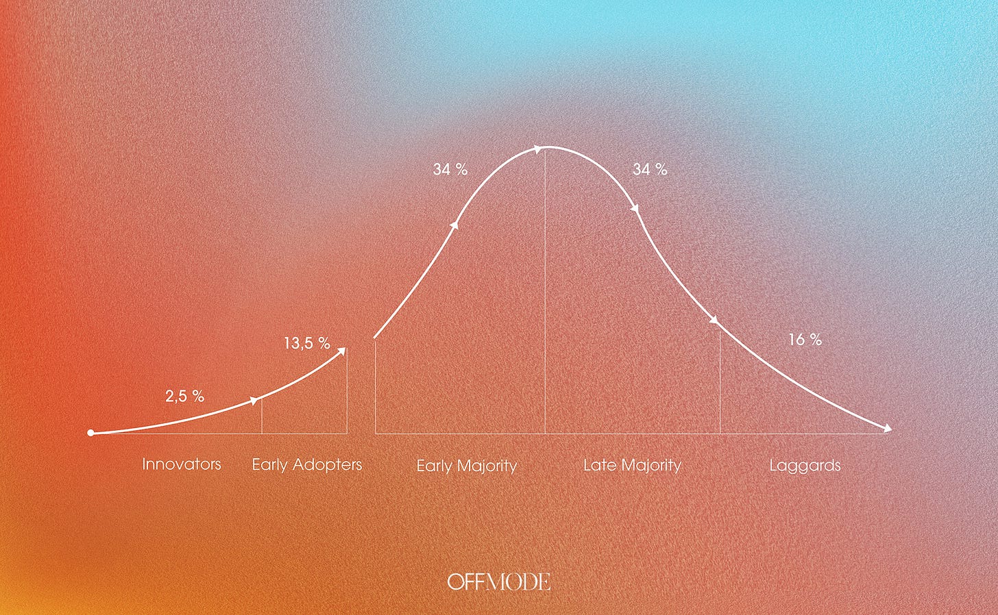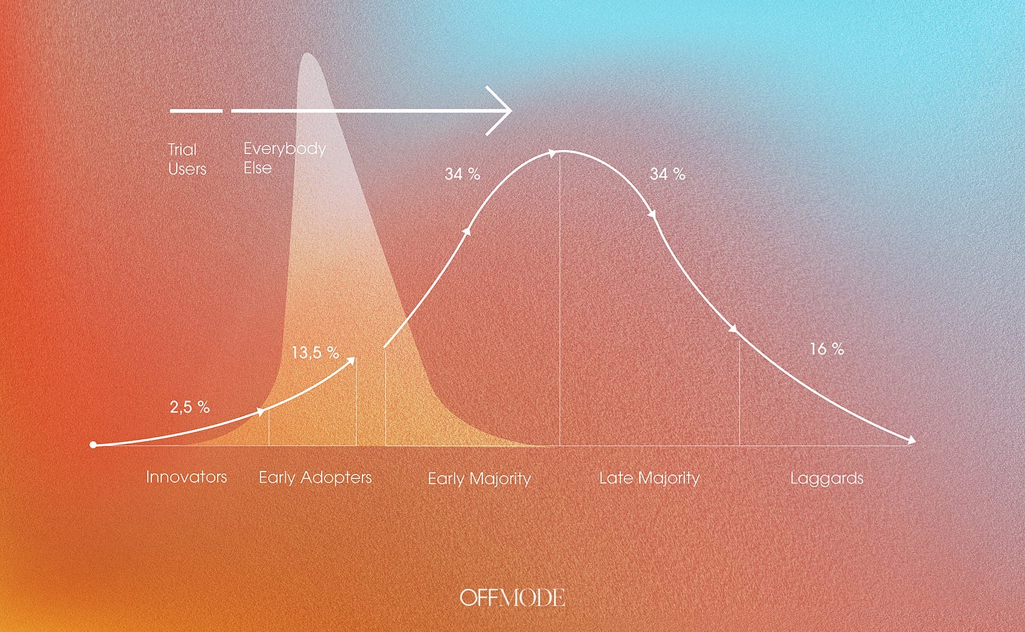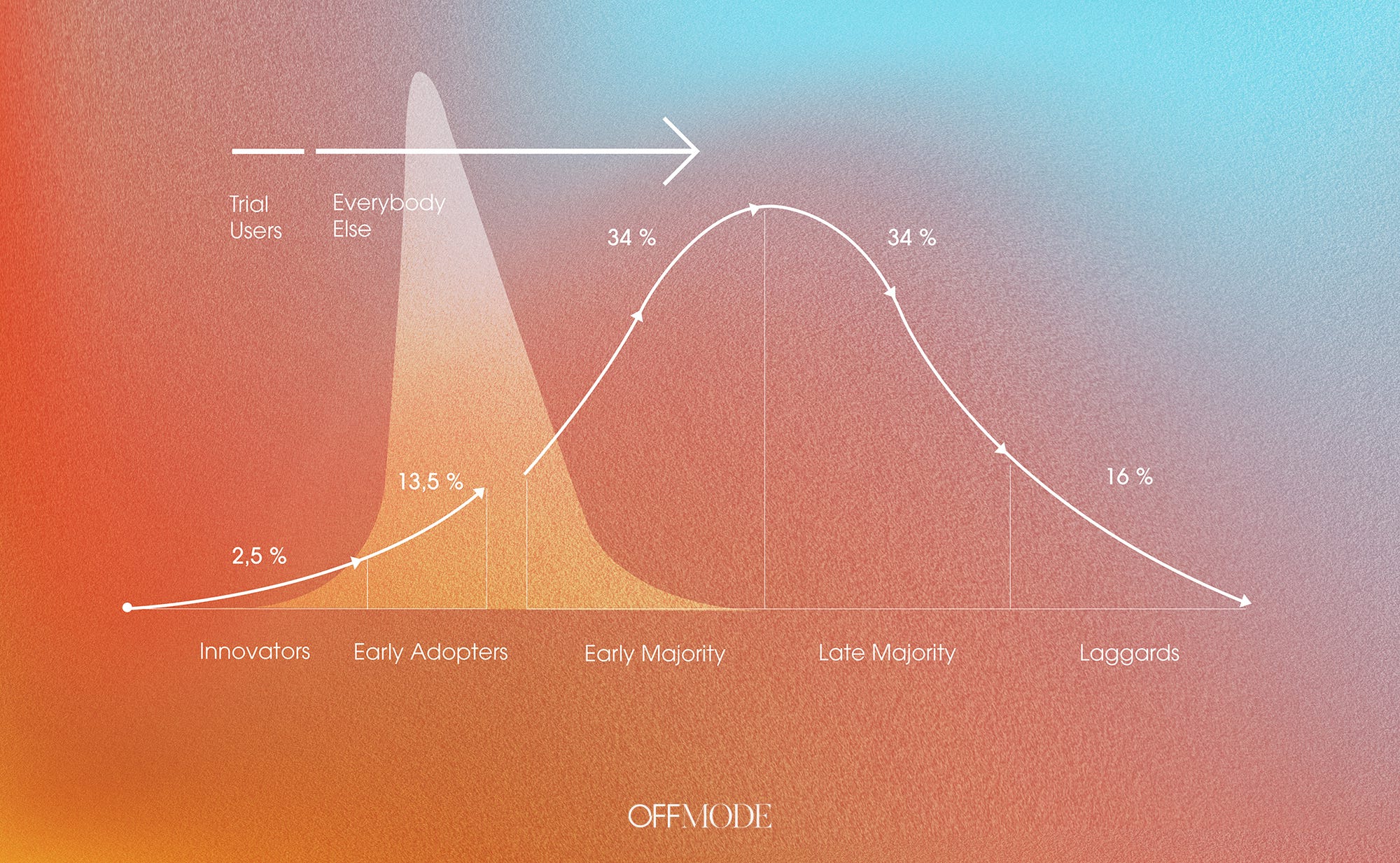 Socioloog Evert Rogers ontwikkelde in 1962 de Adoption Curve: een model dat de levenscyclus van innovaties (technologieën, producten, ideeën) in een groep visualiseert. De klokvormige curve laat zien hoe stijlen en trends zich ontwikkelen, van de introductie tot de piek en het verval. Elke trend, ook in de mode, verliep (houd dit woord vast) op deze manier: