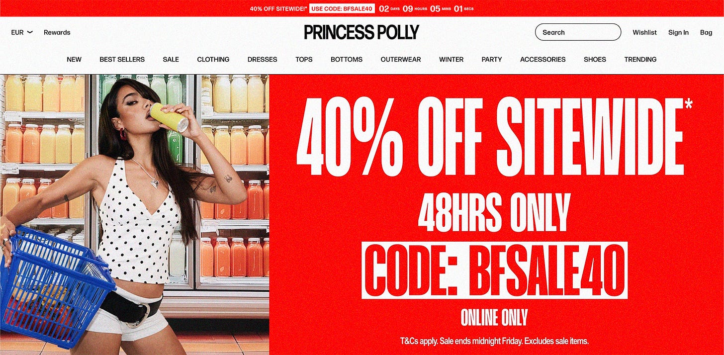 Dat zo’n merk, met zo’n productievolume en zo’n omloopsnelheid, onmogelijk duurzaam kan zijn, lijkt me duidelijk. Het hele model drijft op overproductie en overconsumptie. De enorme “Black Friday Early Deals 40% 1000’s of styles” onderstreept dit. Sinds deze week kleurt de homepage actierood en lopen er telletjes die aangeven hoe lang de site wide flash sale nog duurt: