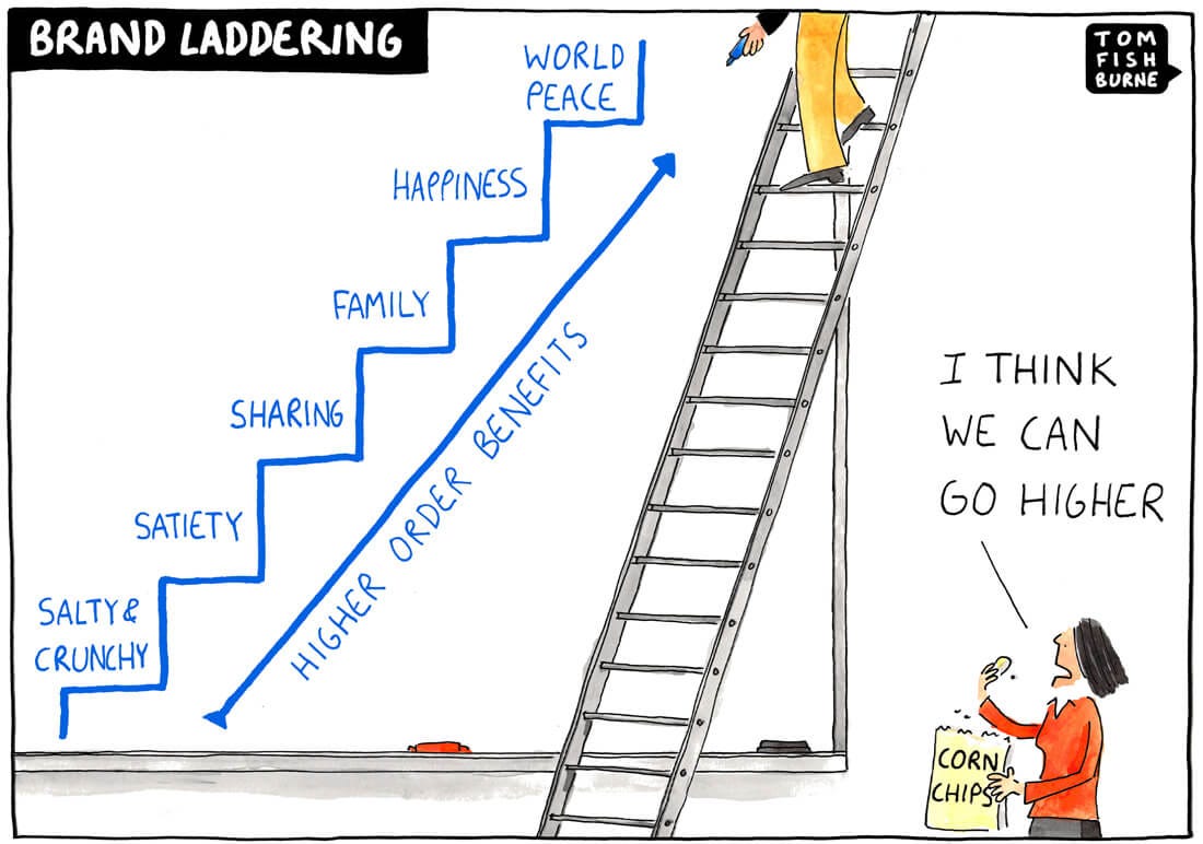 De Brand Ladder (een populair marketingprincipe dat ik nog ken uit mijn tijd als merkstrateeg) speelt daar perfect op in: eerst verkoopt een merk je een product, daarna een voordeel, dan een emotie en op de allerhoogste trede wordt ons een identiteit verkocht. En zodra dat lukt, geloven we dat de waarde van een moment in een product zit: