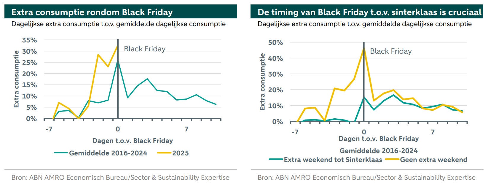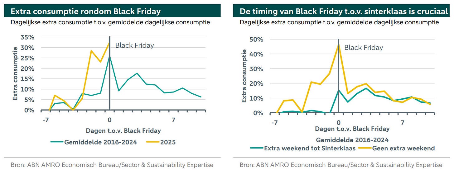 En daar stopt het niet; de overconsumptieperiode begint elk jaar eerder. Volgens het nieuwe Black Friday rapport van ABN Amro geven mensen sinds 2016 in die periode gemiddeld 25% meer uit dan in de weken ervoor. Dit jaar ging het nog harder: 30% extra consumptie.