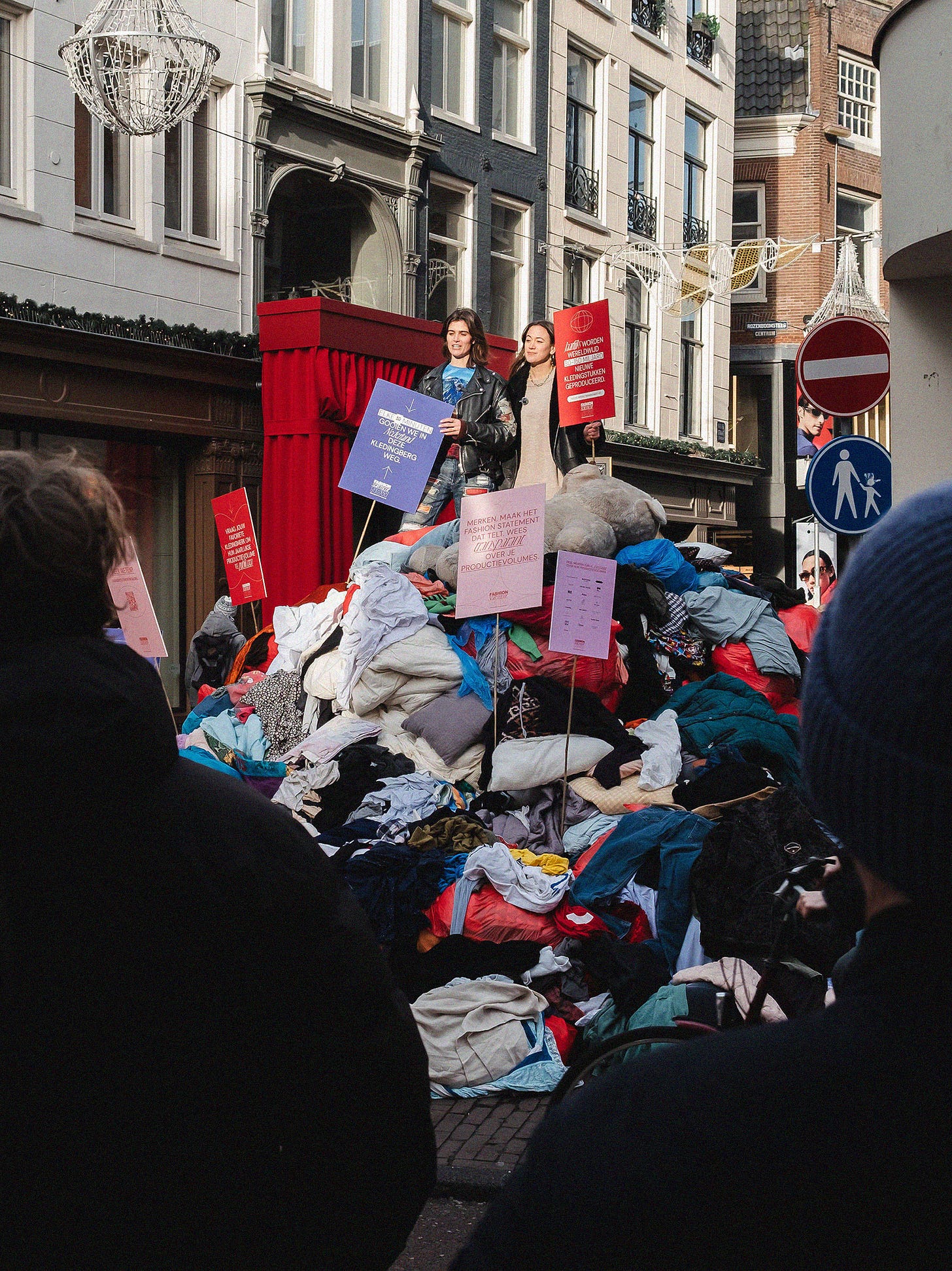 Eind december stond ik midden op de Kalverstraat. Niet om te shoppen (wat dacht jij nou), maar bovenop een berg afgedankte kleding. Samen met de Dutch Sustainable Fashion Circle, een duurzaam modecollectief waar ik bij hoor, visualiseerden we de hoeveelheid textiel die we in Nederland elke tien(!) minuten weggooien.